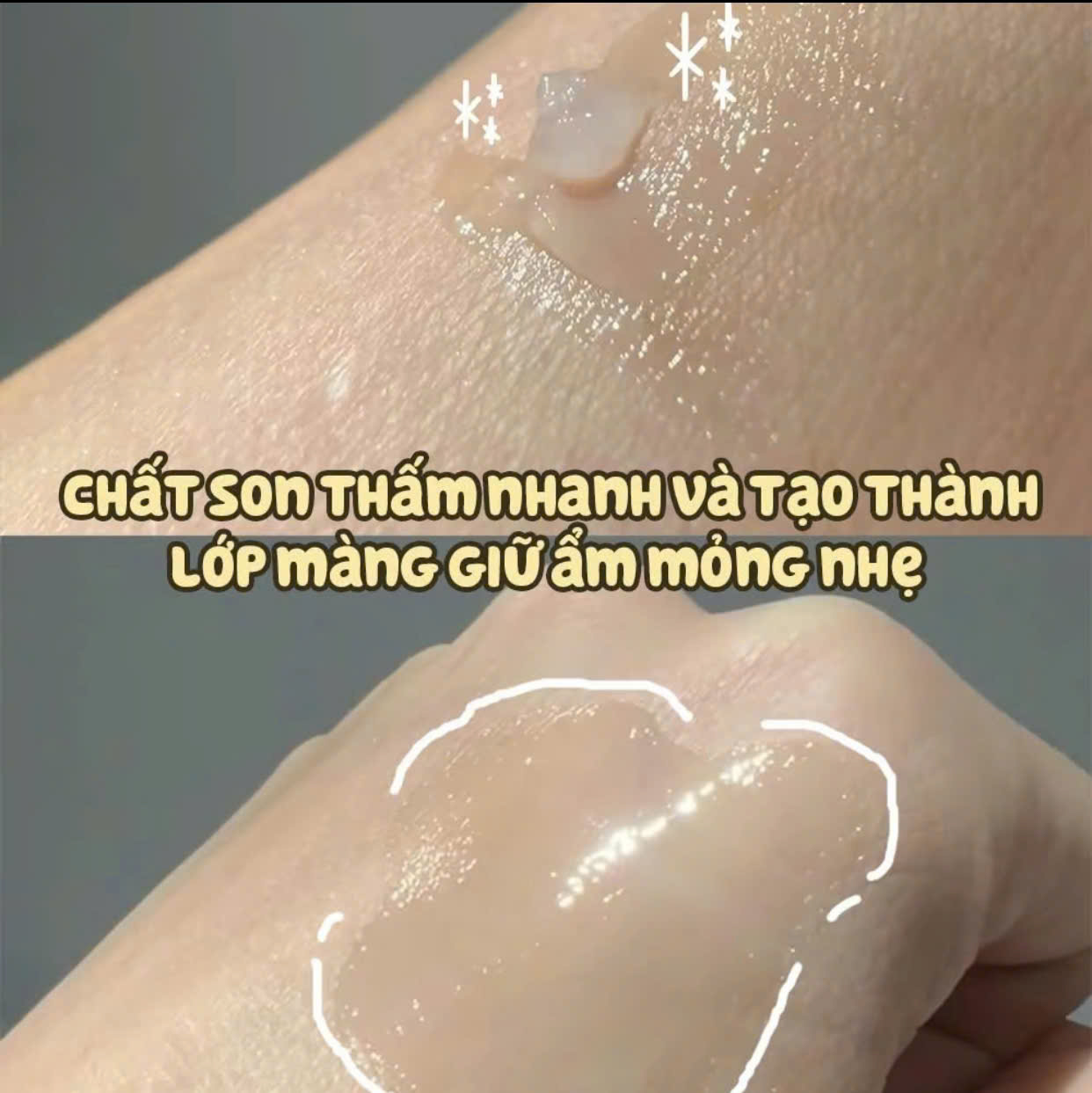 - Chất son đặc dính nhưng không gây cảm giác khó chịu, thấm nhanh và tạo thành lớp màng giữ ẩm mỏng nhẹ, giúp duy trì độ ẩm cho môi.