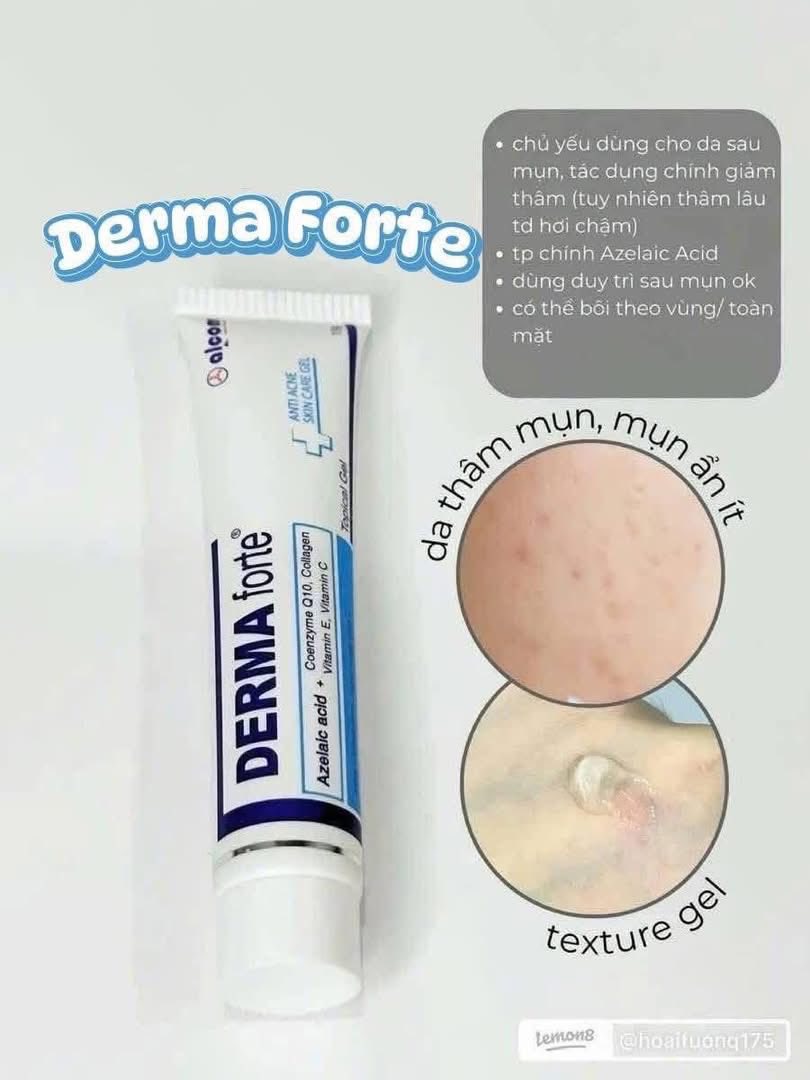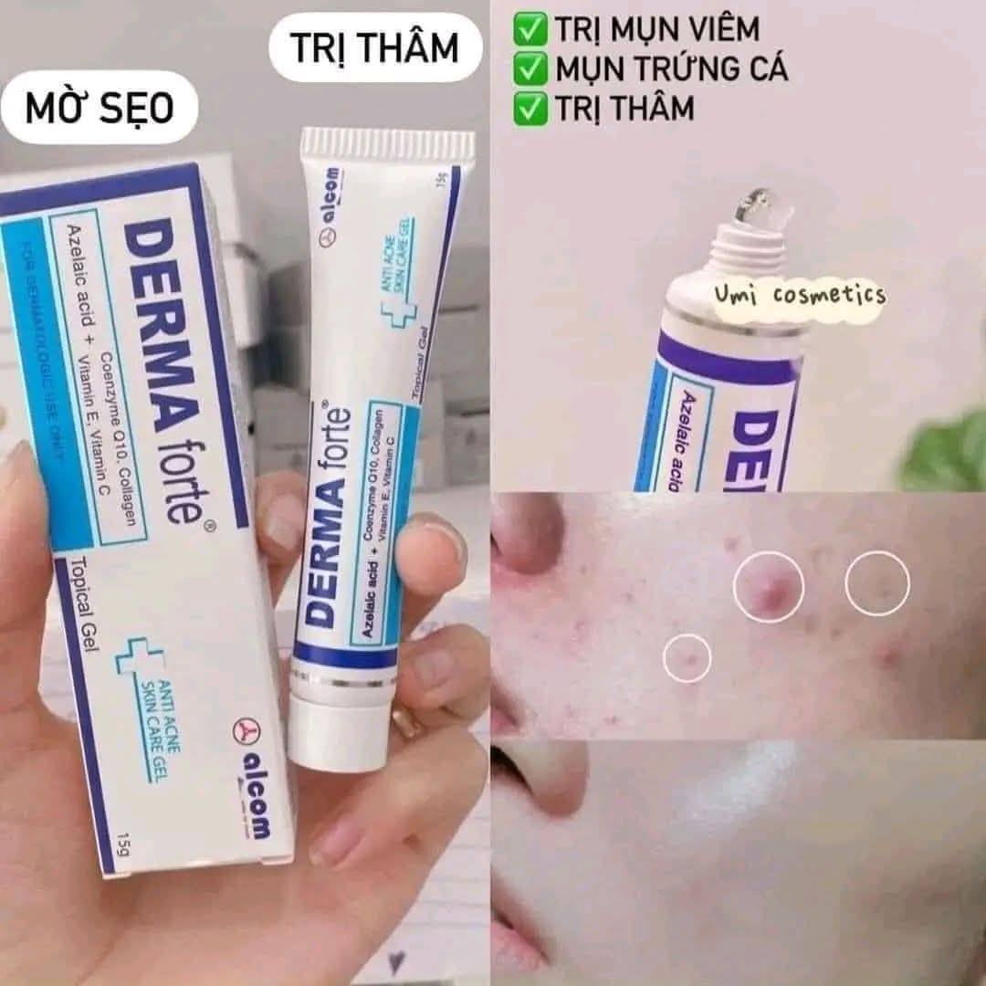 Gel Hỗ Trợ Giảm Mụn, Giảm Thâm Derma Forte Topical Gel là gel dưỡng hỗ trợ giảm mụn. Sản phẩm thuộc thương hiệu Gamma Chemicals. Gel dưỡng có khả năng làm khô nhân mụn, mờ vết thâm sẹo. Nhờ công thức tiên tiến với nền gel không nhờn, dễ thấm nên Derma Forte không những ức chế, tiêu diệt Propionibacteria acnes, trong nhân mụn mà còn thấm sâu ngăn cản việc hình thành nhân mụn.