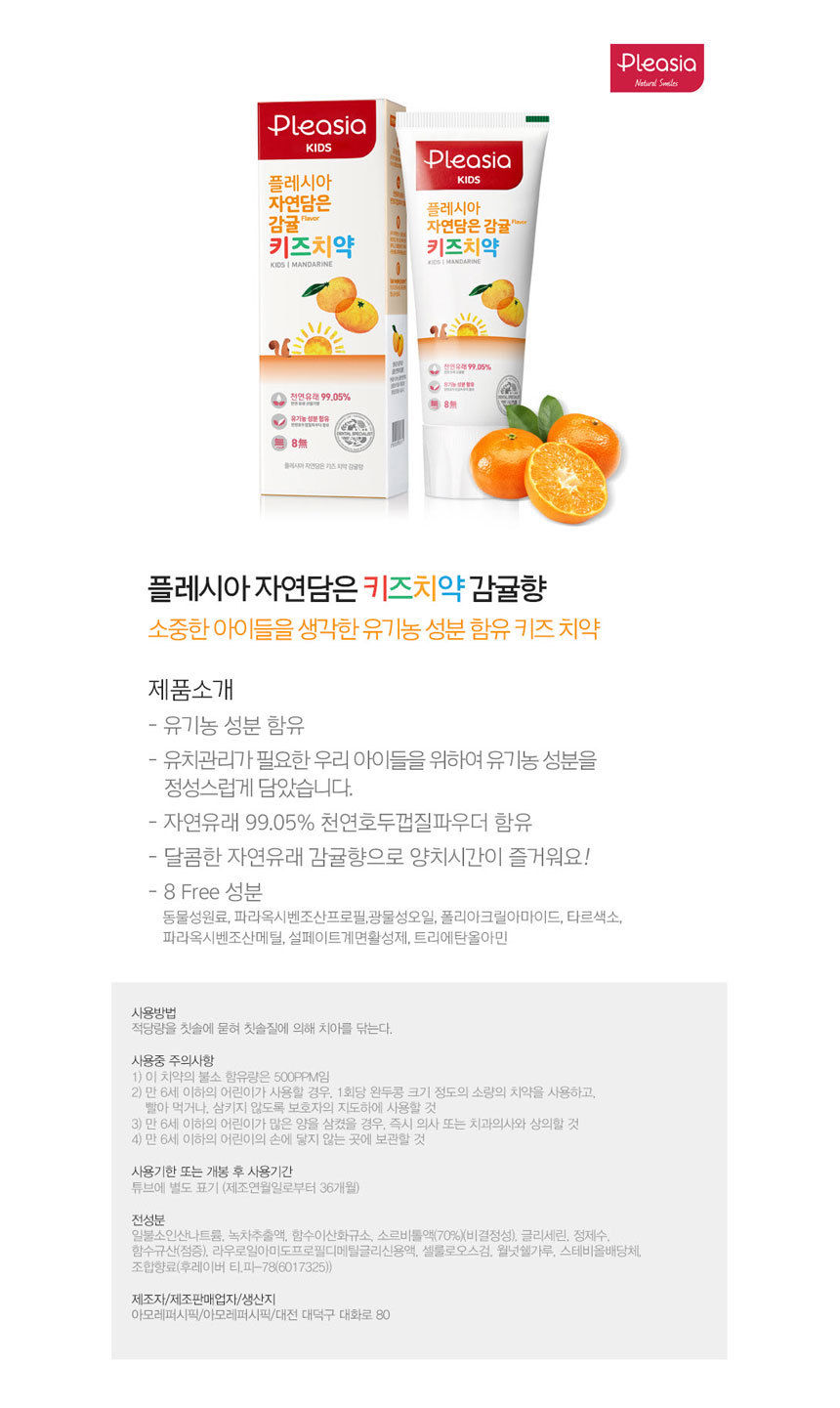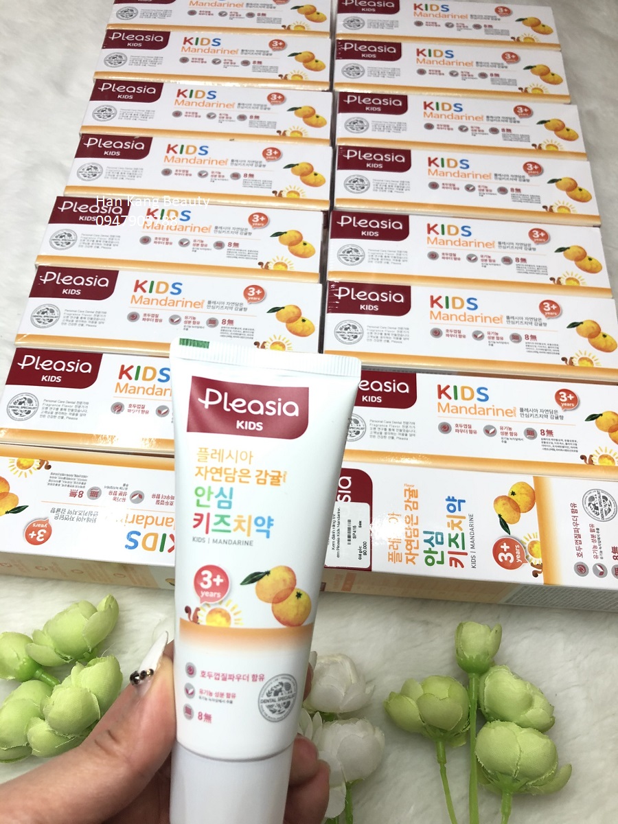 - Kem đánh răng Pleasia Kids Mandarine là kem đánh răng dành cho trẻ em vị quả quýt dành cho trẻ từ 3 tuổi trở lên, với các thành phần trong kem Pleasia Mandarine sẽ giúp hàm răng của bé trắng sáng tự nhiên, giúp bé có hơi thở thơm mát, ngoài ra giúp bổ sung canxi cho răng giúp răng chắc khỏe hơn và tránh tình trạng sâu răng.