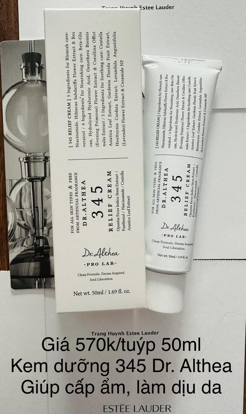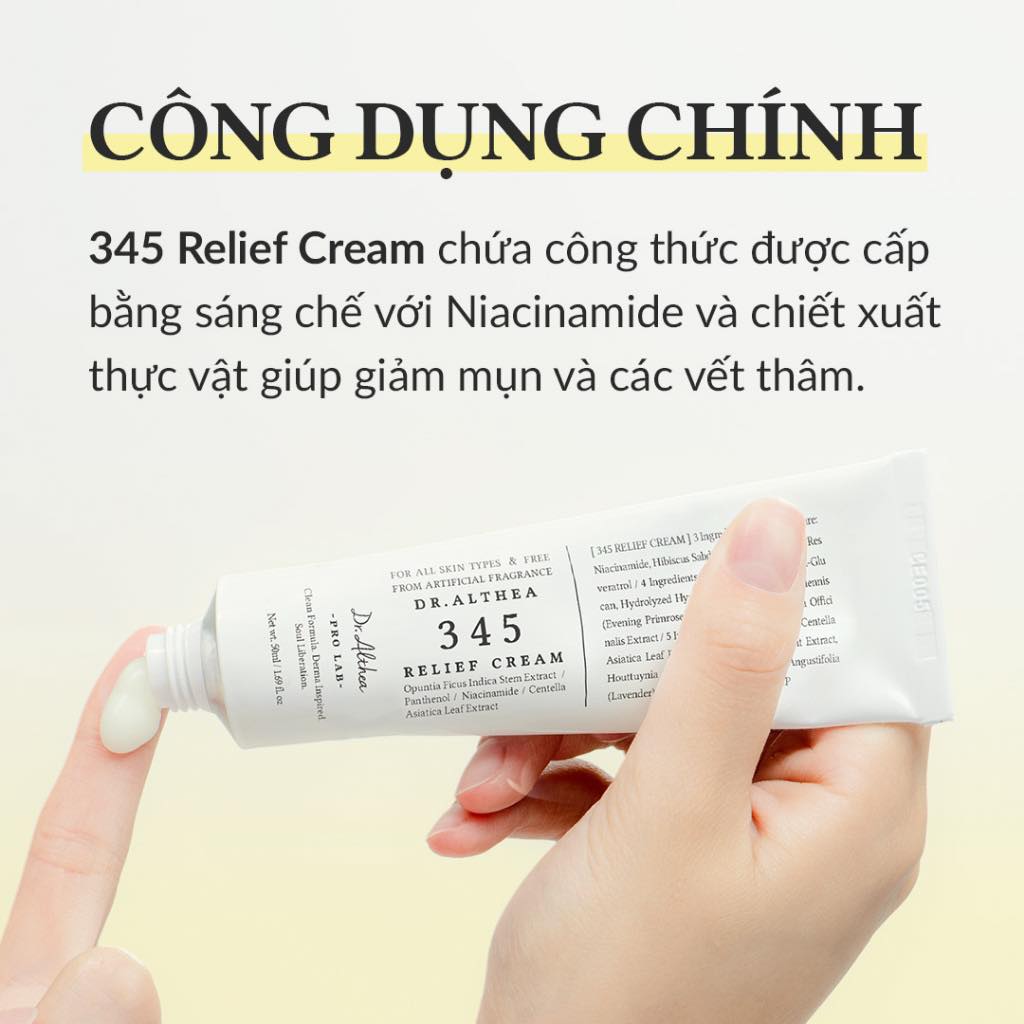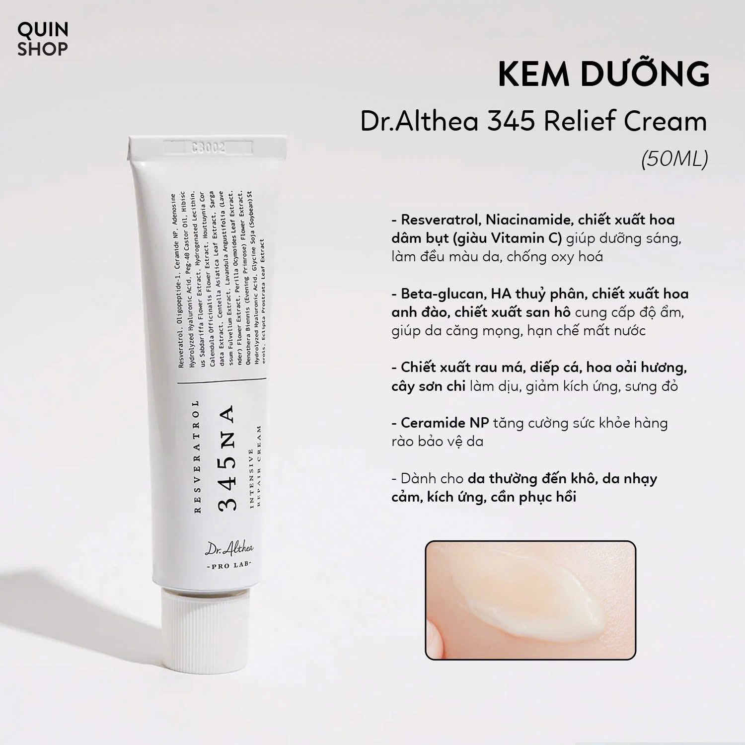 - Kem dưỡng ẩm, phục hồi da Dr.Althea 345 Relief Cream với thành phần chứa Niacinamide, Resveratrol, Hoa dâm bụt, Vitamin E đẩy lùi tình trạng xỉn màu, thâm sạm, cải thiện sắc tố, làm đều màu da và chống lão hóa sớm.