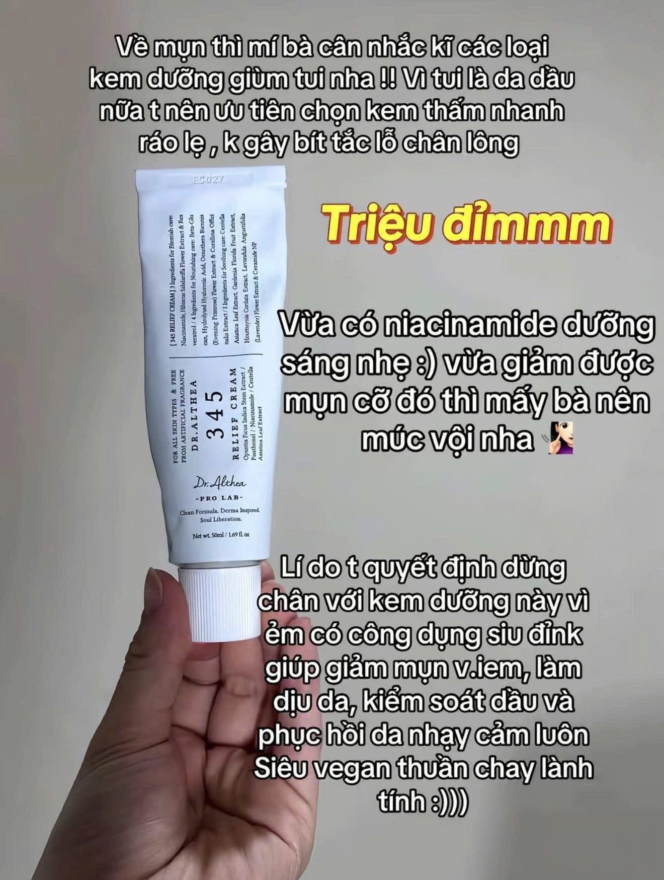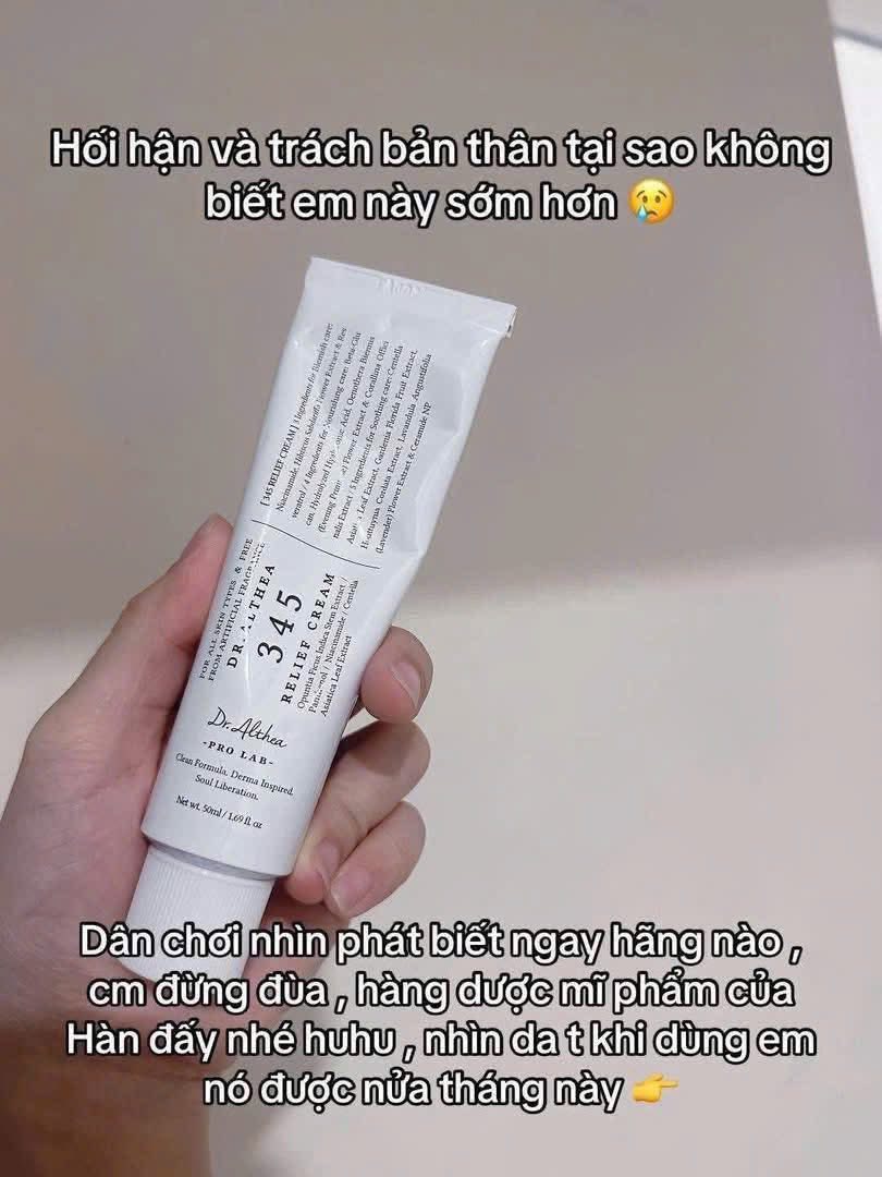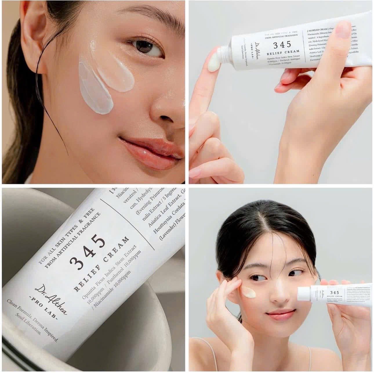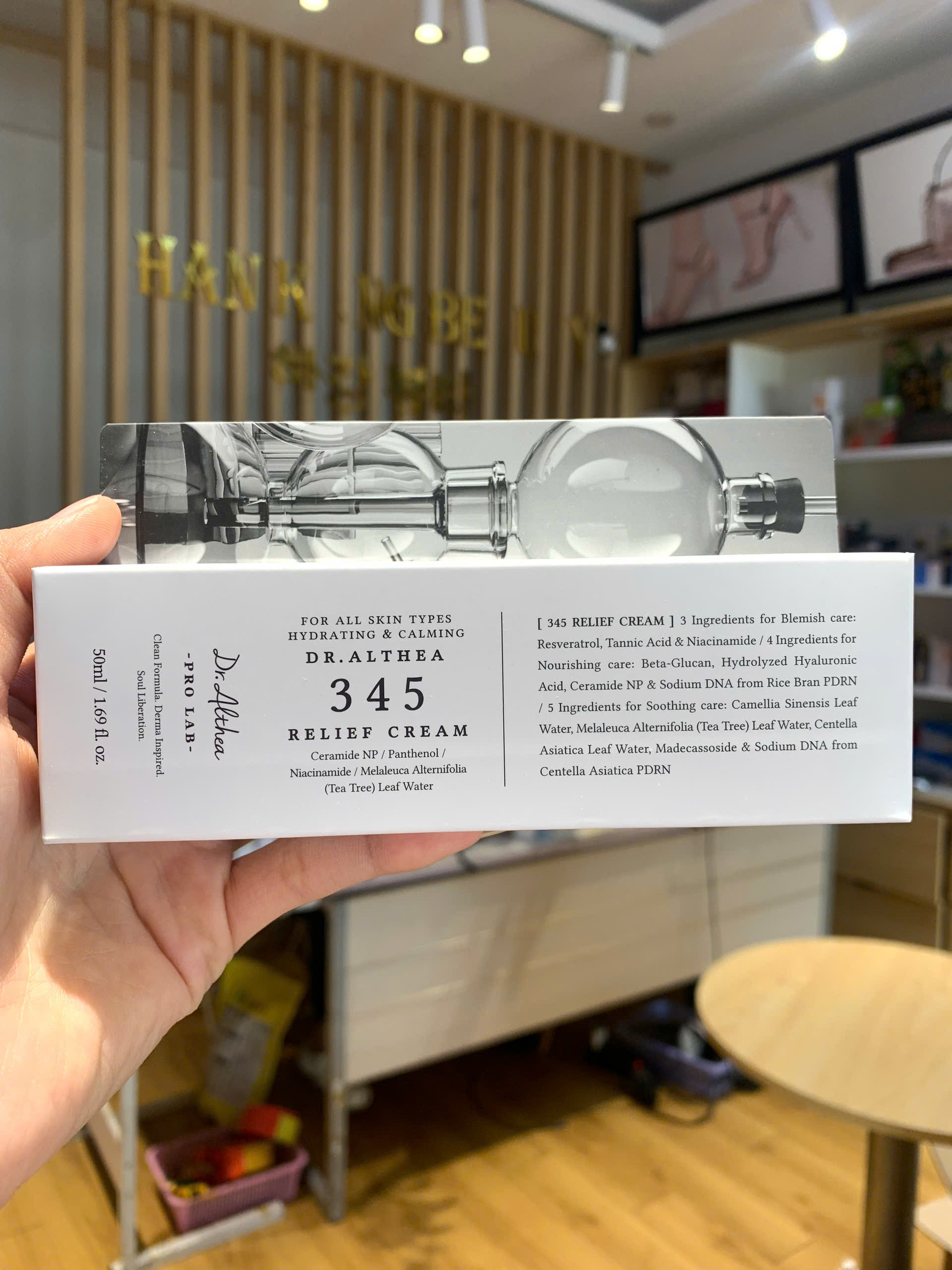 - 345 Relief Cream gần đây đang nổi lên như một hiện tượng của giới mỹ phẩm, xuất hiện trên nhiều clip review hàng triệu lượt xem trên MXH. Dòng kem dưỡng đến từ thương hiệu dược mỹ phẩm Top 5 Hàn Quốc - Dr.Althea có tác dụng như 1 dòng kem dưỡng ẩm đa chức năng. Đặc biệt, bên cạnh khả năng skincare, 345 Relief Cream còn được tiết lộ là loại dưỡng ẩm "bí mật" apply trước lớp makeup - được các chuyên gia trang điểm sử dụng cho các idol Hàn.