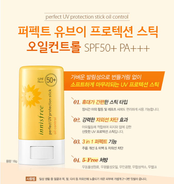 Innisfree Perfect UV Protection Stick Oil Control SPF50+ PA+++với thiết kế dạng thỏi tiện lợi, dễ dàng sử dụng trong các hoạt động ngoài trời hay các hoạt động thể thao.Kem chống nắng kiềm dầu của Innisfree Perfect UV Protection Stick Oil Control SPF50+ PA+++ cực kì hiệu quả khi đi ngoài trời với tác dụng chống tia tử ngoại, đồng thời ngăn tăng tiết mồ hôi và bã nhờn của cơ thể.