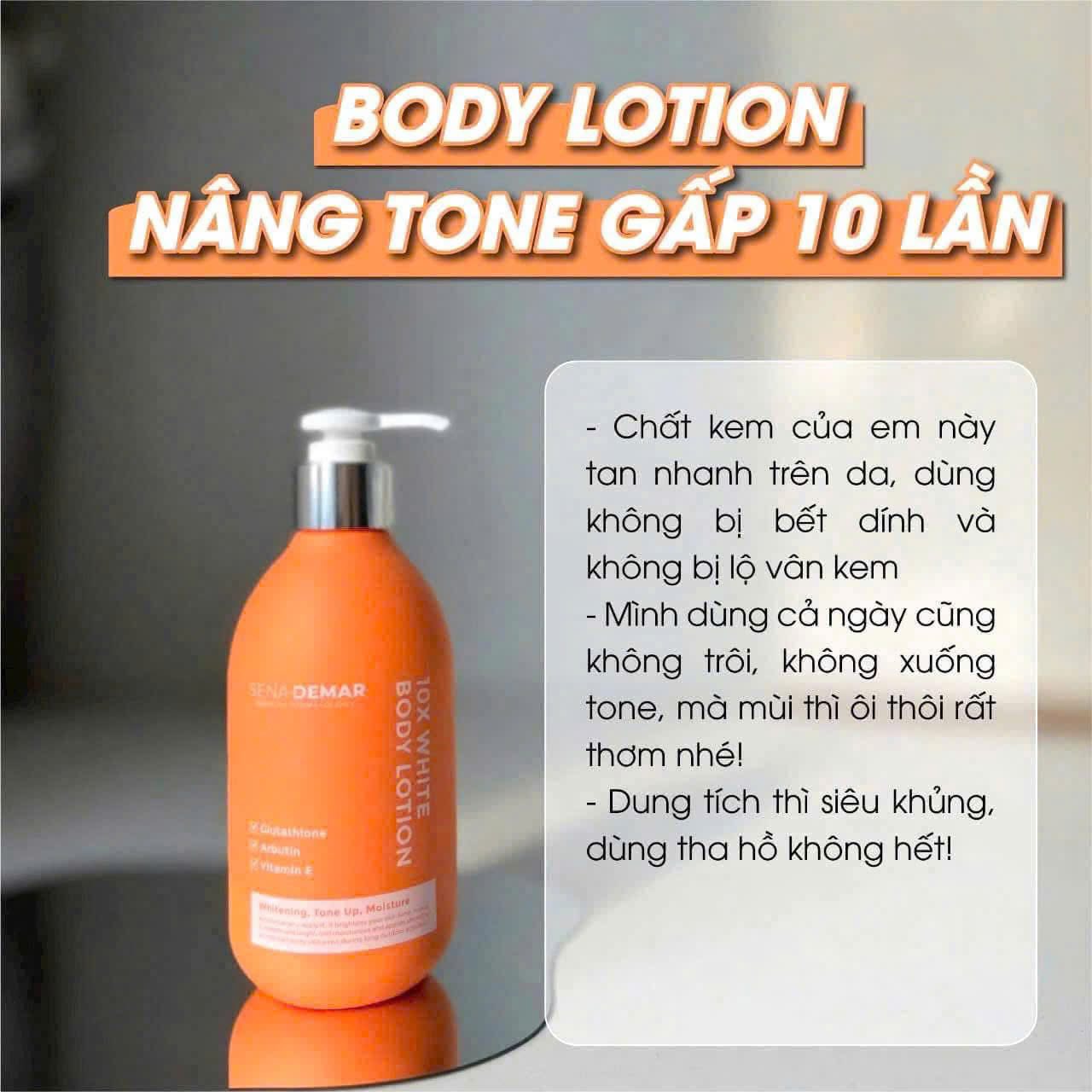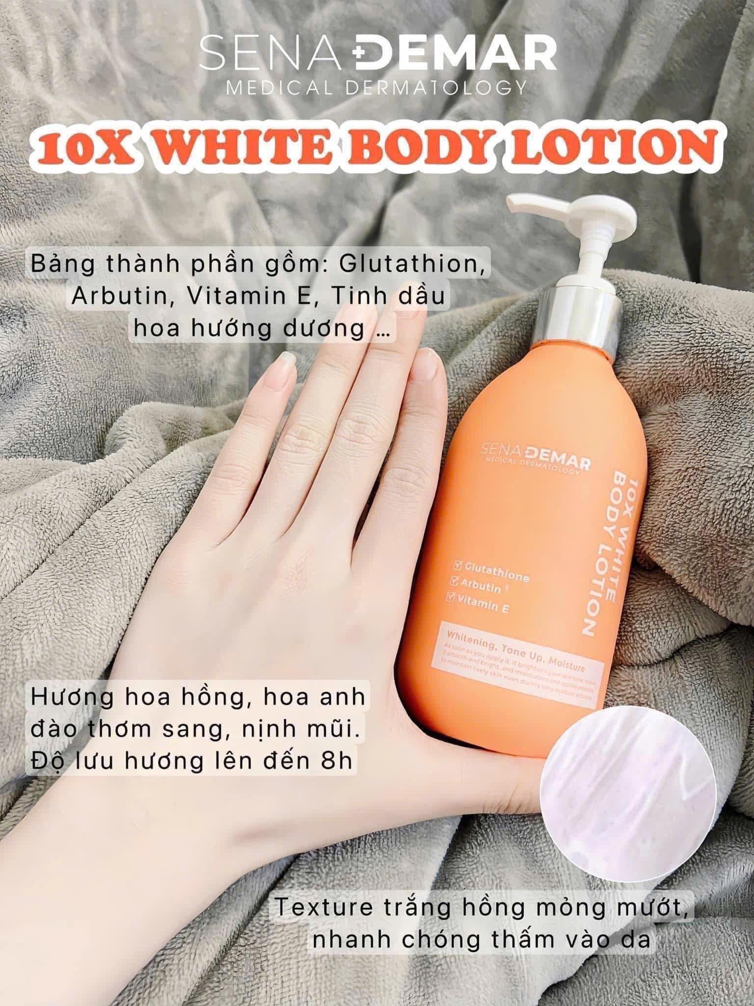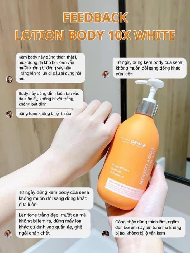 Sữa dưỡng thể nâng tone da trắng hồng 10X white body lotion SENA DEMAR 300ml có chứa Glutathione , Alpha Arbutin , vitamin E và các chiết xuất từ thực vật như hoa hồng , cam đắng , cúc la mã , hoa mơ … giúp nuôi dưỡng da trắng sáng hồng hào tràn đầy sức sống.