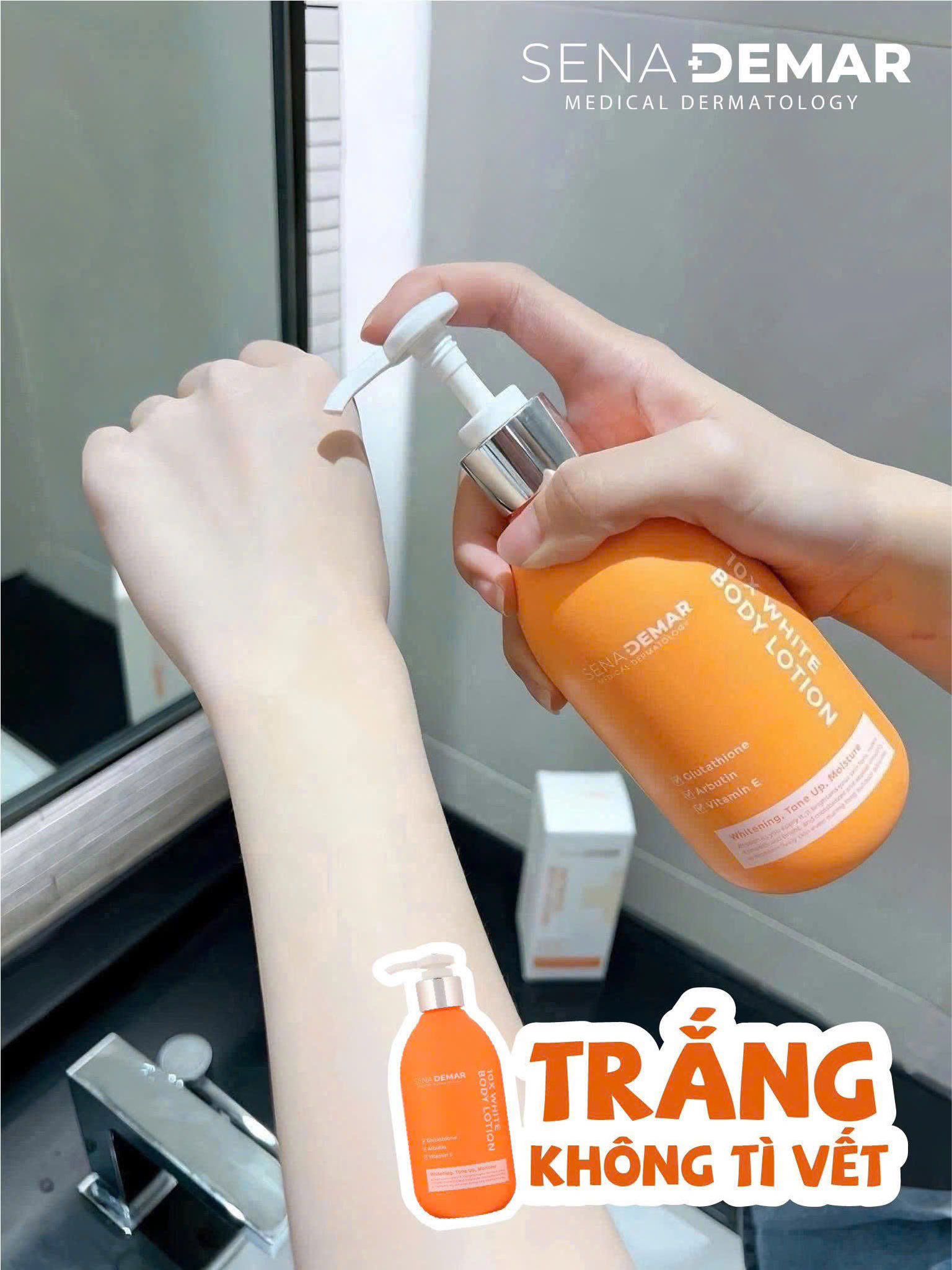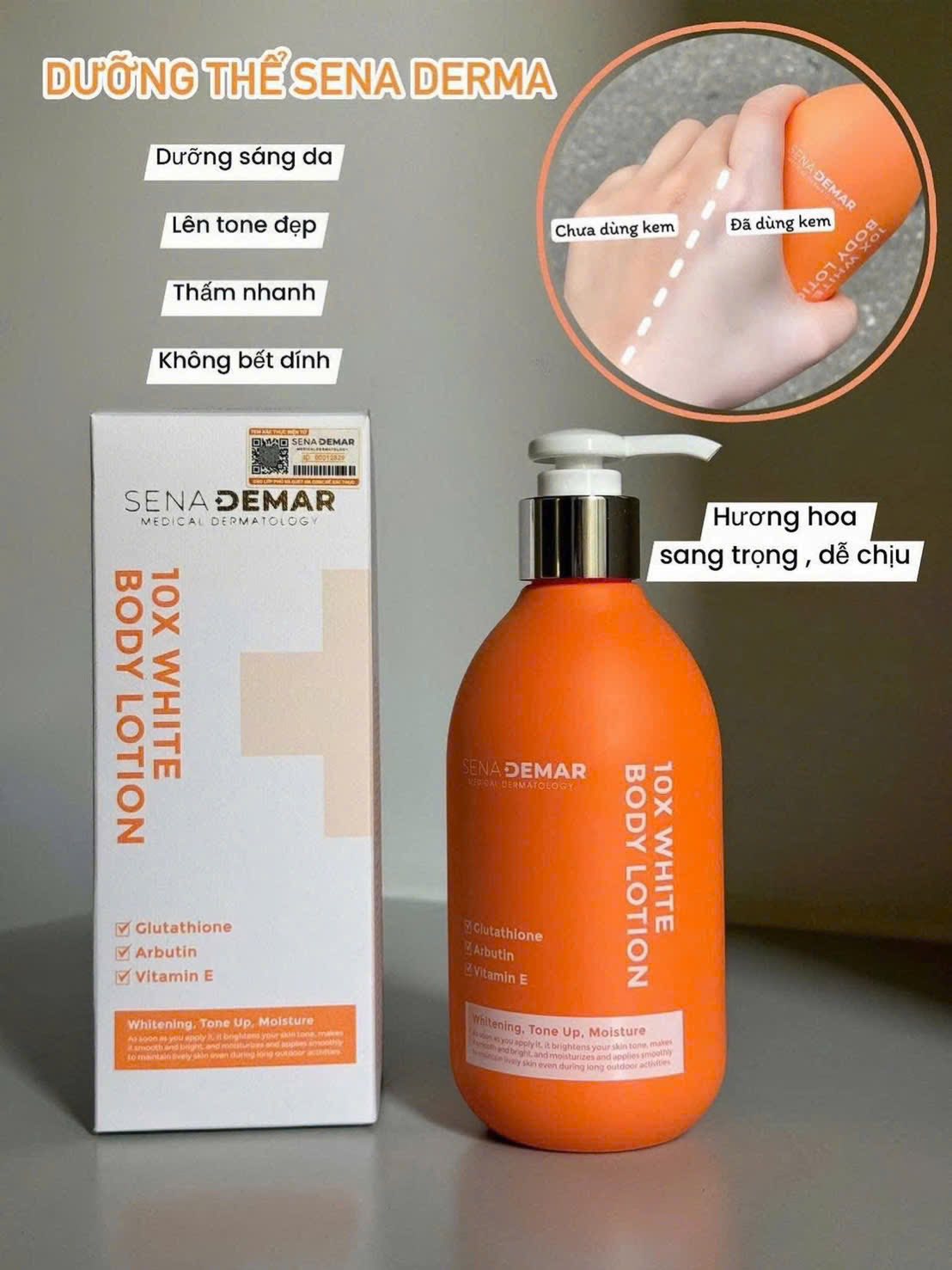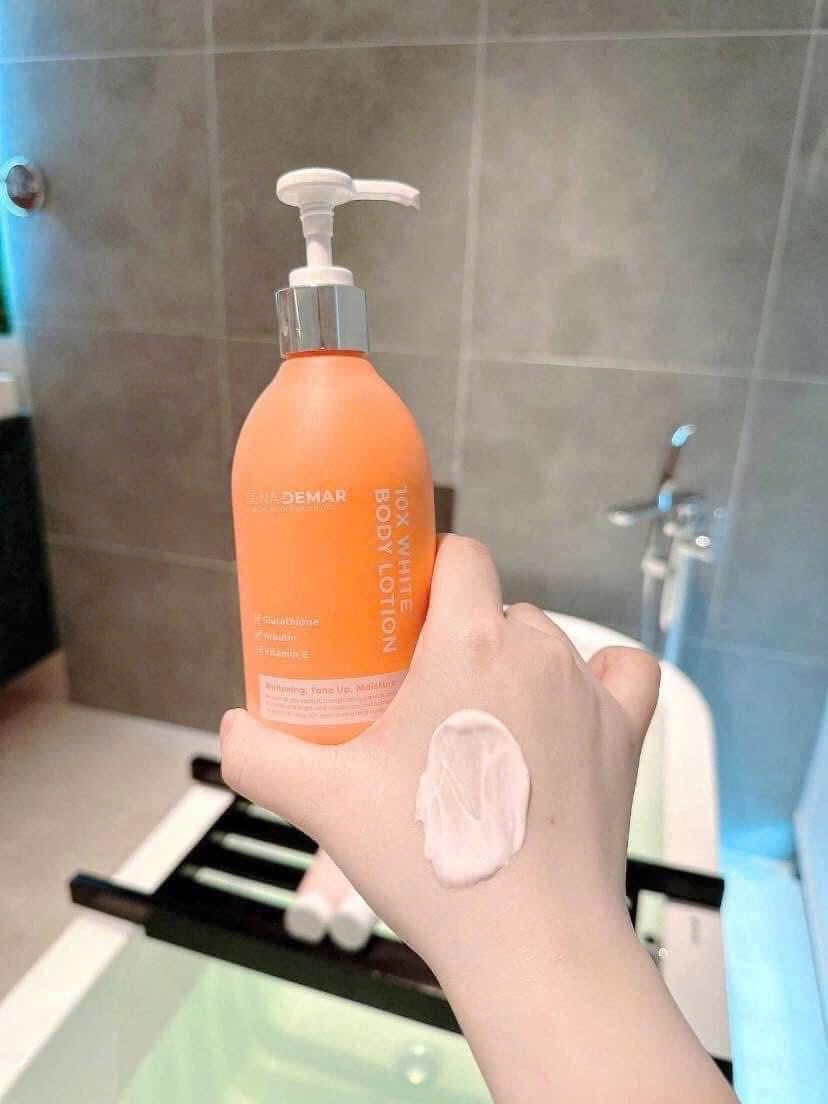 Sữa dưỡng thể nâng tone da trắng hồng 10X white body lotion SENA DEMAR 300ml có chứa Glutathione , Alpha Arbutin , vitamin E và các chiết xuất từ thực vật như hoa hồng , cam đắng , cúc la mã , hoa mơ … giúp nuôi dưỡng da trắng sáng hồng hào tràn đầy sức sống.