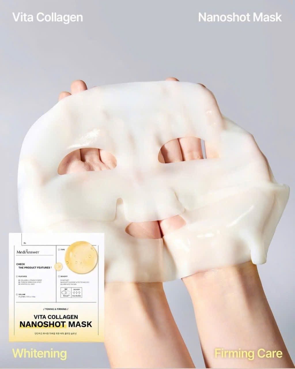+ Medianswer Sáng Mịn Da Vita Collagen NanoShot Mask (Vàng): Hỗ trợ dưỡng trắng và tăng cường căng bóng, đàn hồi da. Phù hợp với mọi loại da. Da xỉn màu, thiếu sức sống, da kém đàn hồi, lão hoá