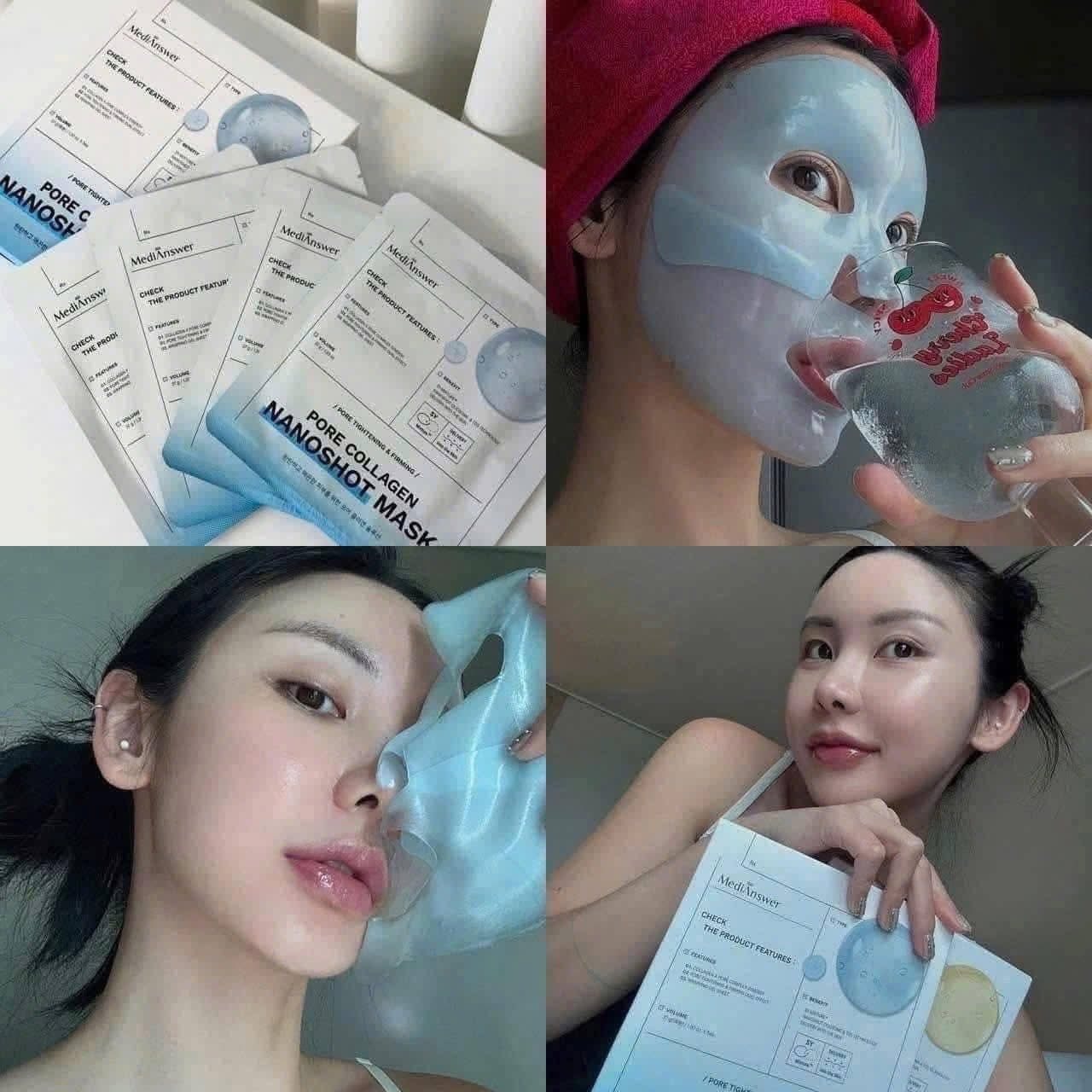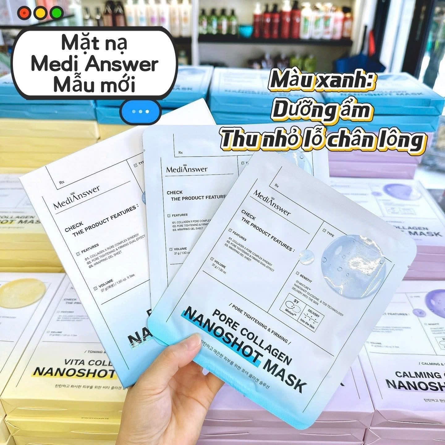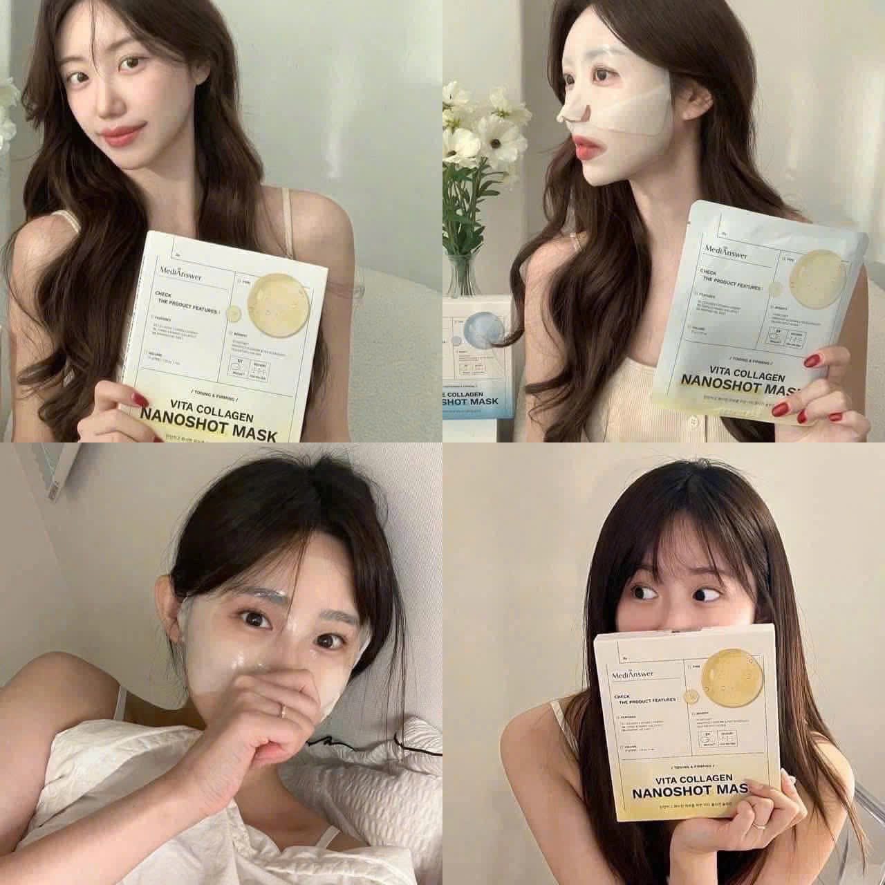 - Medianswer Collagen Nanoshot Mask phiên bản mới được bổ sung thêm 100DA nano collagen và nano vitamin C - dạng phân tử siêu nhỏ giúp dưỡng chất thẩm thấu vào da tốt hơn và tăng cường hiệu quả làm căng sáng da.