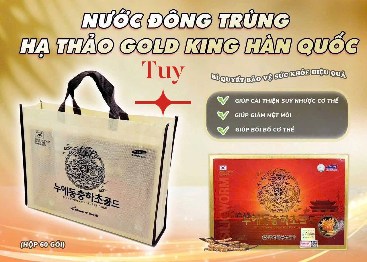 Nước Đông Trùng Hạ Thảo KangHwa Silkworm Cordyceps Gold (60 Gói x 30ml) là một sản phẩm cao cấp, được chiết xuất từ từ đông trùng hạ thảo tự nhiên đạt tiêu chuẩn, kết hợp với các thảo dược quý hiếm khác. Sản phẩm này mang đến nhiều lợi ích cho sức khỏe, đặc biệt là tăng cường sức đề kháng, chống lão hóa và cải thiện chức năng gan thận.