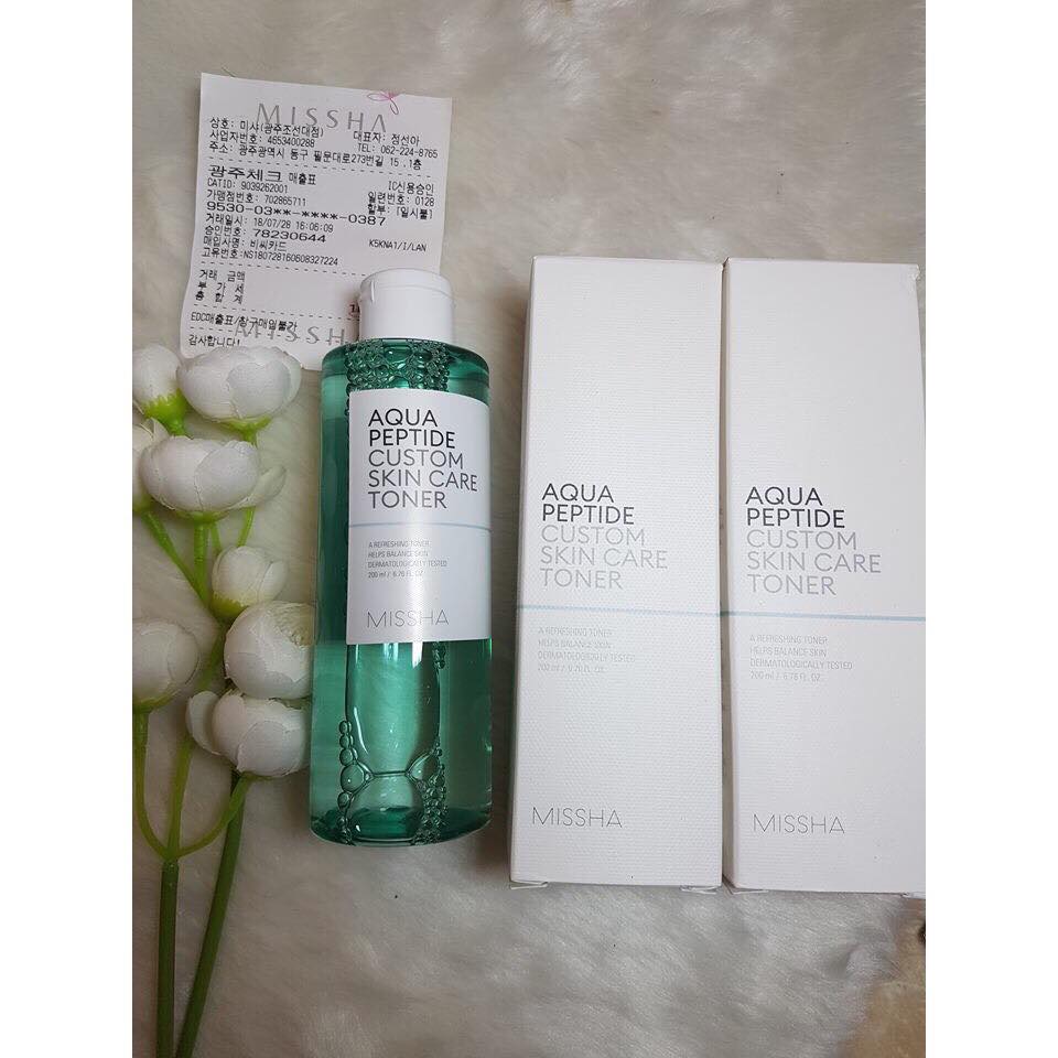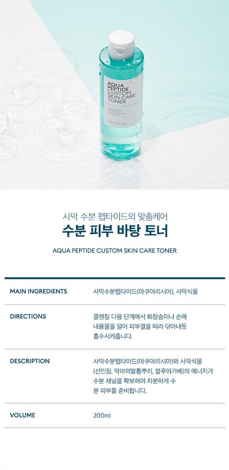 - Missha Aqua Peptide Custom Skin Care Toner với thành phần chính là hợp chất peptide đến từ cây xương rồng cung cấp độ ẩm dồi dào. Cho làn da nàng luôn tươi tắn.