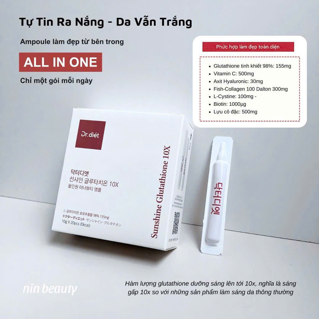 Dr Diet Sunshine Glutathion 10X với 7 nguyên liệu làm đẹp được tổng hợp trong 1 ống làm đẹp, hàm lượng vượt trội và độ tinh khiết.