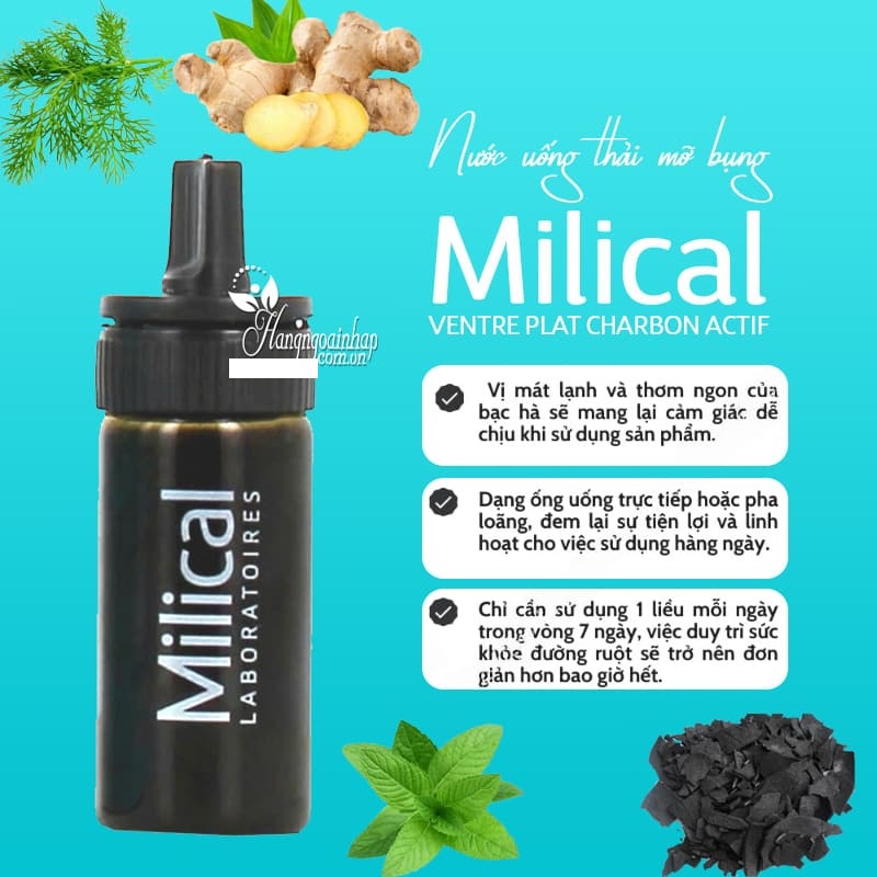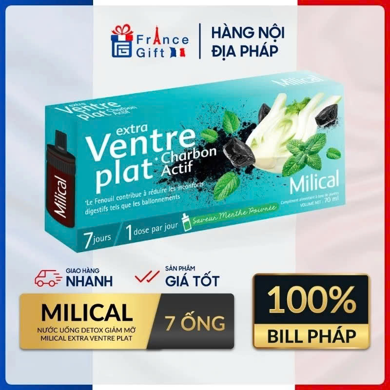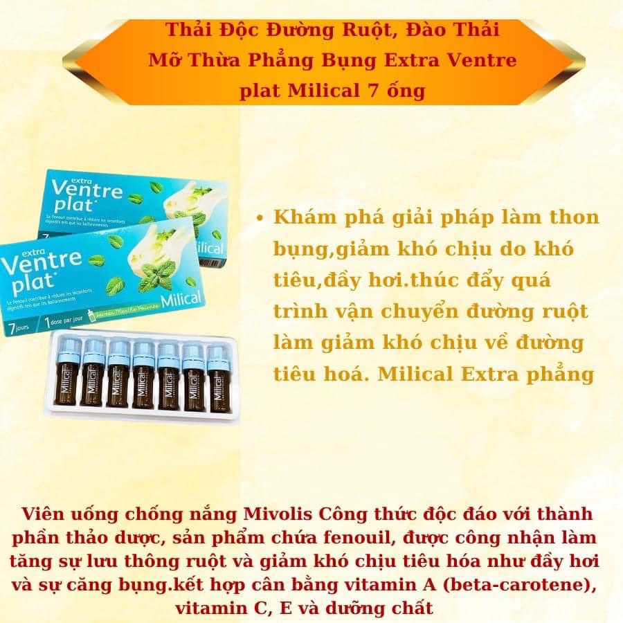 - Milical Extra Ventre Plat là sản phẩm detox hỗ trợ đào thải mỡ thừa đến từ Pháp, được sản xuất trên công nghệ hiện đại và có nguồn gốc từ thực vật, đảm bảo an toàn cho sức khỏe.