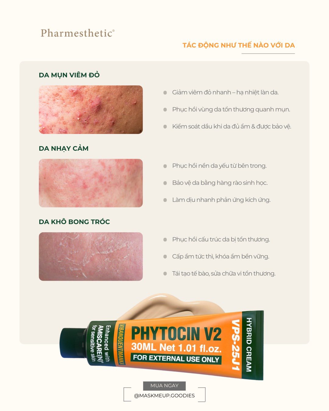 Đặc biệt phù hợp cho da đang gặp tình trạng mụn trứng cá, kích ứng, mẩn đỏ, nhạy cảm.