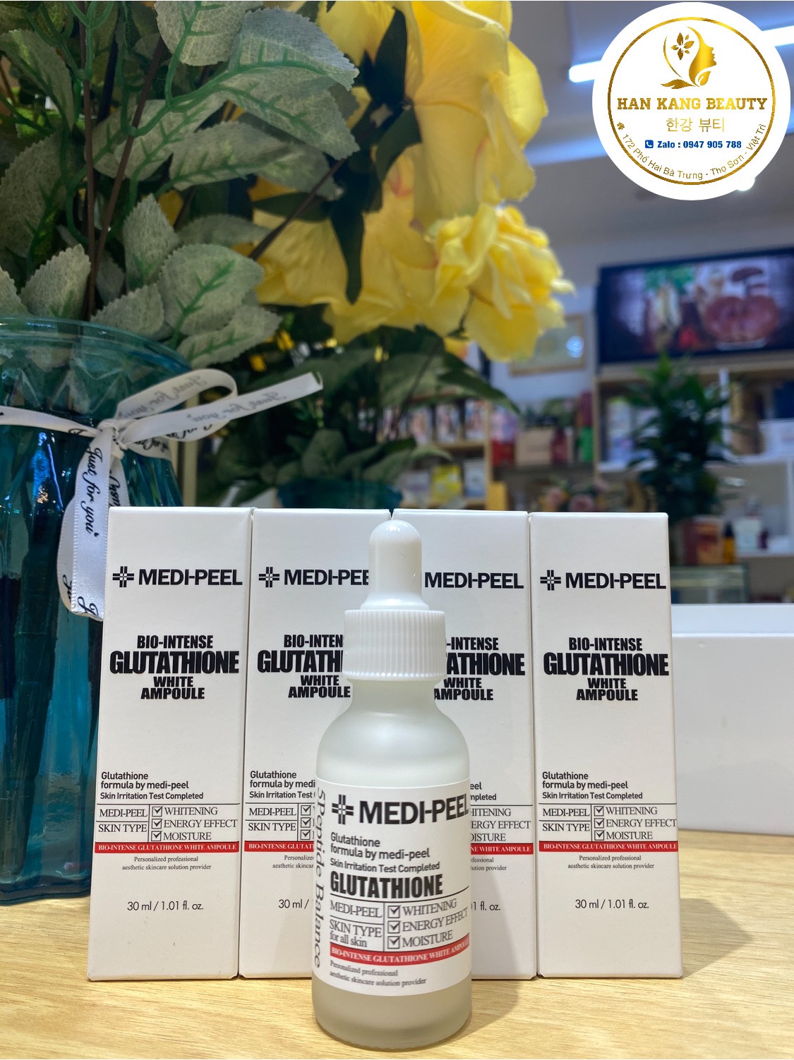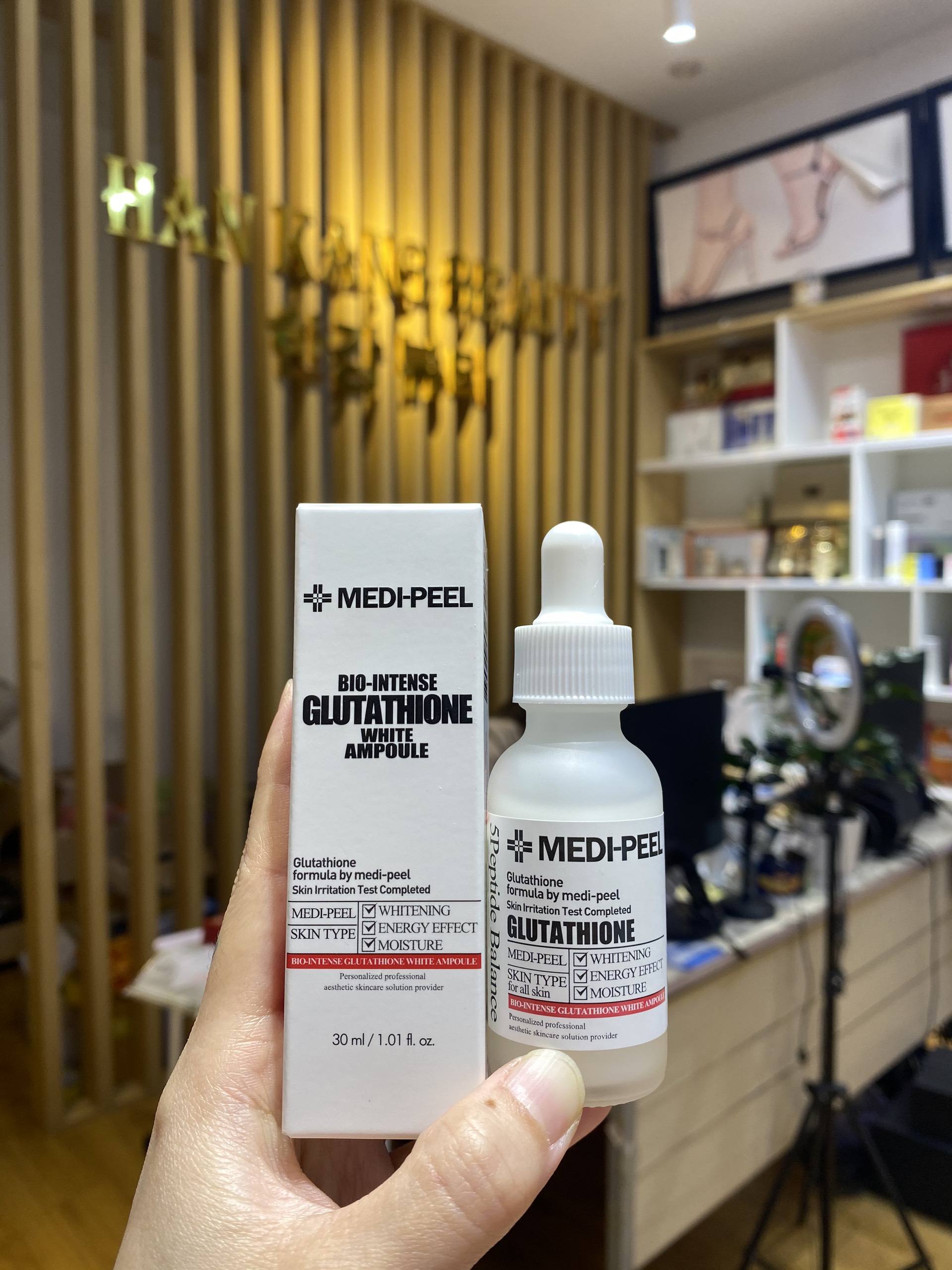 Serum Medi peel Bio-Intense Glutathione white ampoule sản phẩm dưỡng da với hàm lượng cao Glutathione giúp tăng hiệu quả làm trắng da nhanh và hiệu quả hơn so với các sản phẩm thông thường.