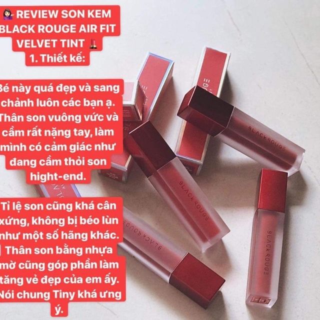 - Black Rouge Air Fit Velvet Tint khi mới lên môi rất dễ tán, sau tầm 1 phút son sẽ bắt đầu lì lại. Tạo cho người dùng cảm giác môi mình thoáng và dễ chịu. Không bị bết dính hay vón cục.