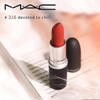 Son MAC 316 Devoted to Chili là sự pha trộn giữa sắc son đỏ với sắc cam nhưng sắc son đỏ có phần chiếm tỉ lệ nhiều hơn so với sắc cam nên cực kì nổi bật, tôn da và dễ mix với nhiều phong cách thời trang khác nhau.