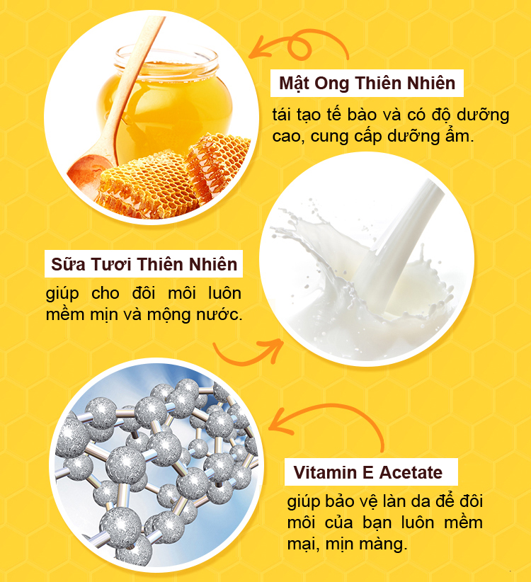 Thành phần: với thành phần chiết xuất từ mật ong thiên nhiên và sữa, kết hợp với các hạt đường siêu mịn giúp nhẹ nhàng lấy đi lớp tế bào chết và những vết thâm trên môi, mang lại cho bạn đôi môi hồng hào, đầy sức sống.